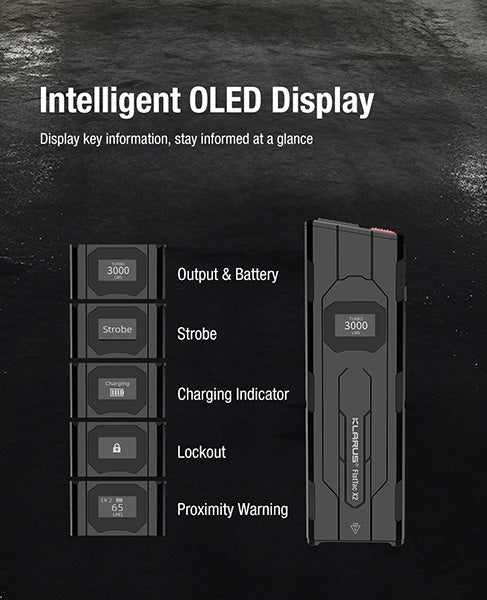 Particulièrement innovante, la Klarus FlatTac X2 inclut un capteur de proximité intelligent pour économie d'énergie et sécurité renforcée détectant automatiquement les obstacles à courte distance. Son écran OLED intelligent affiche les informations clés: puissance, niveau batterie, mode stroboscope, verrouillage et alerte proximité, ainsi en un coup d'œil vous savez tout de suite ou vous en êtes.